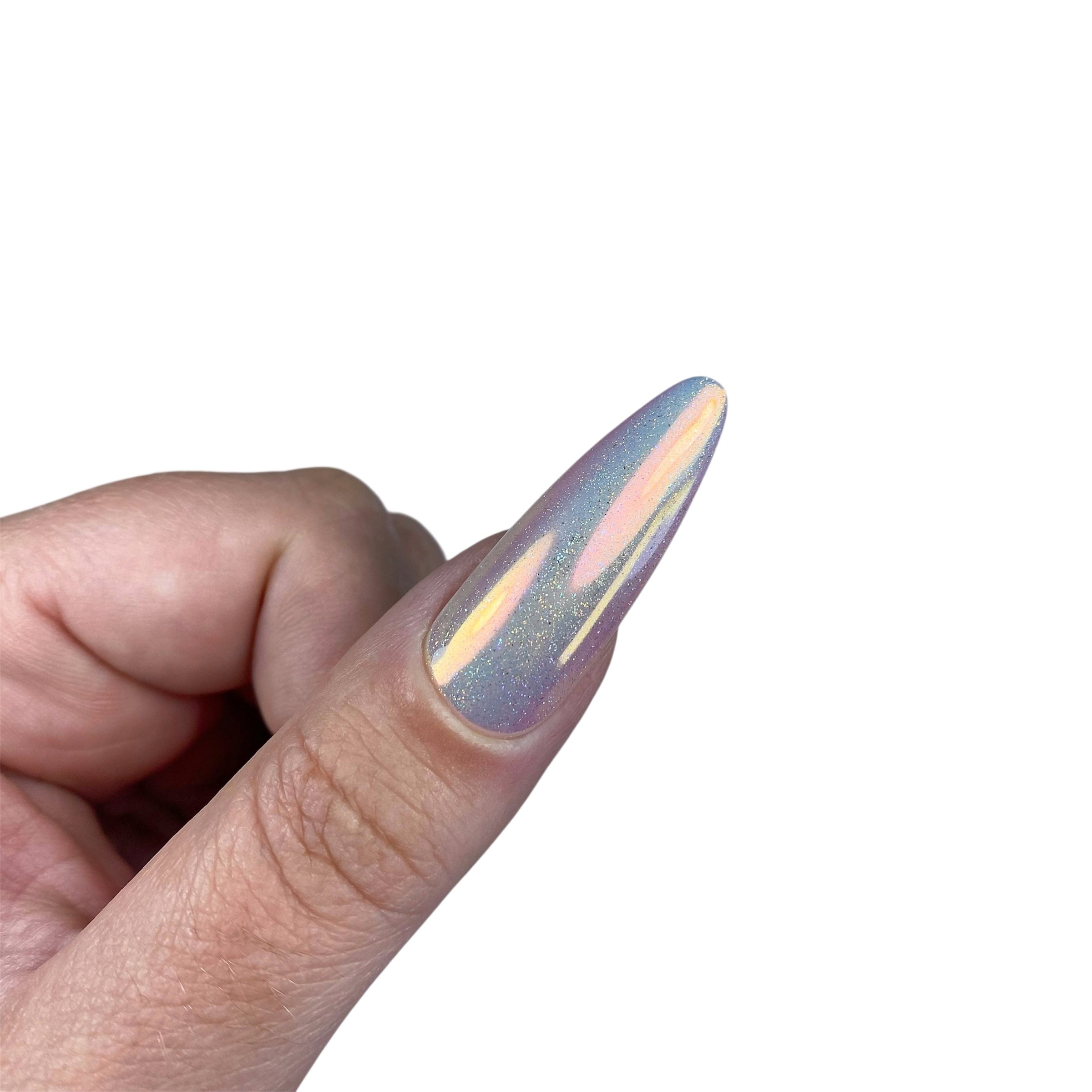 Poudre chrome orange reflet rouge/cuivre, métallisée à reflet et légères paillettes holographiques.