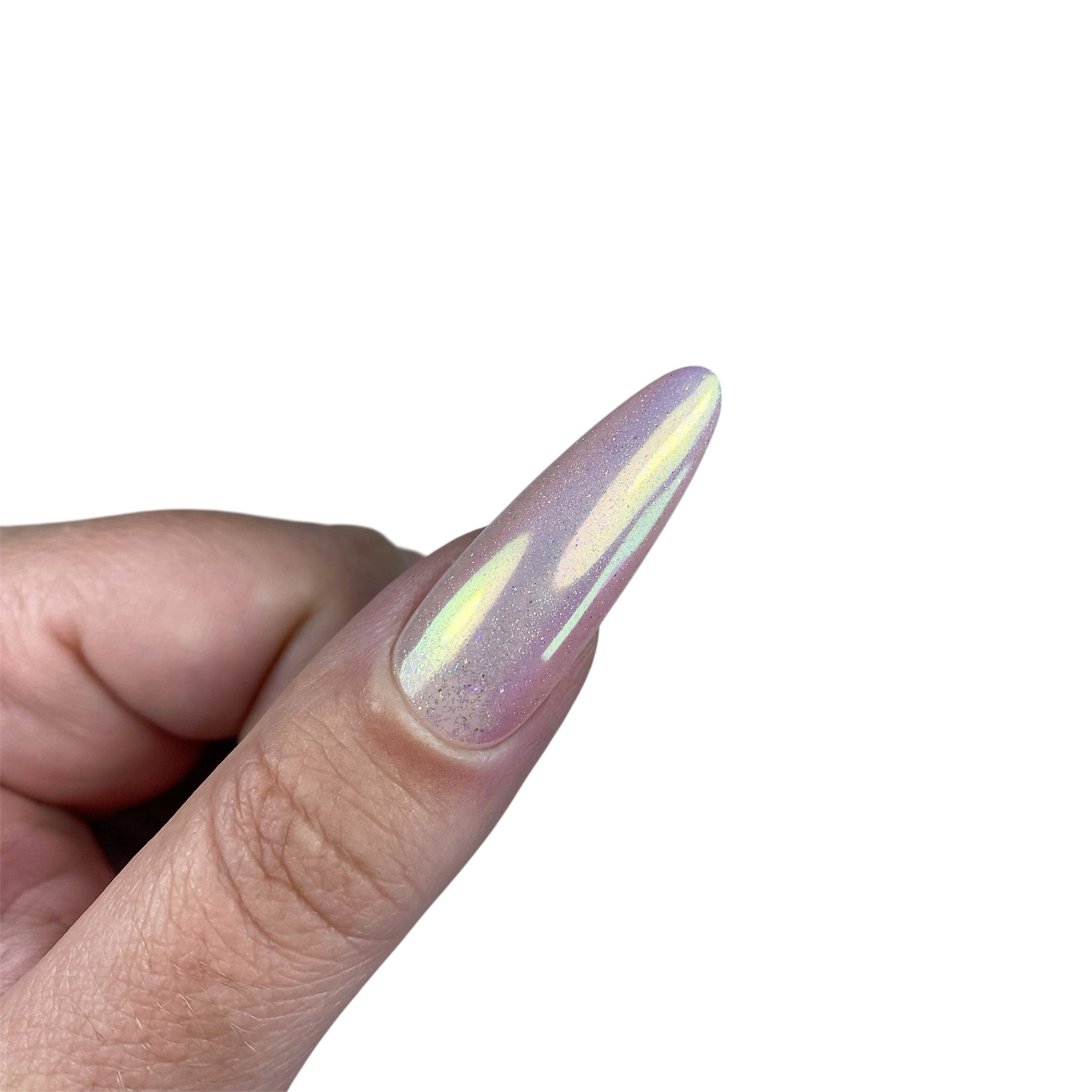 Poudre chrome vert métallisée à reflet et légères paillettes holographiques.