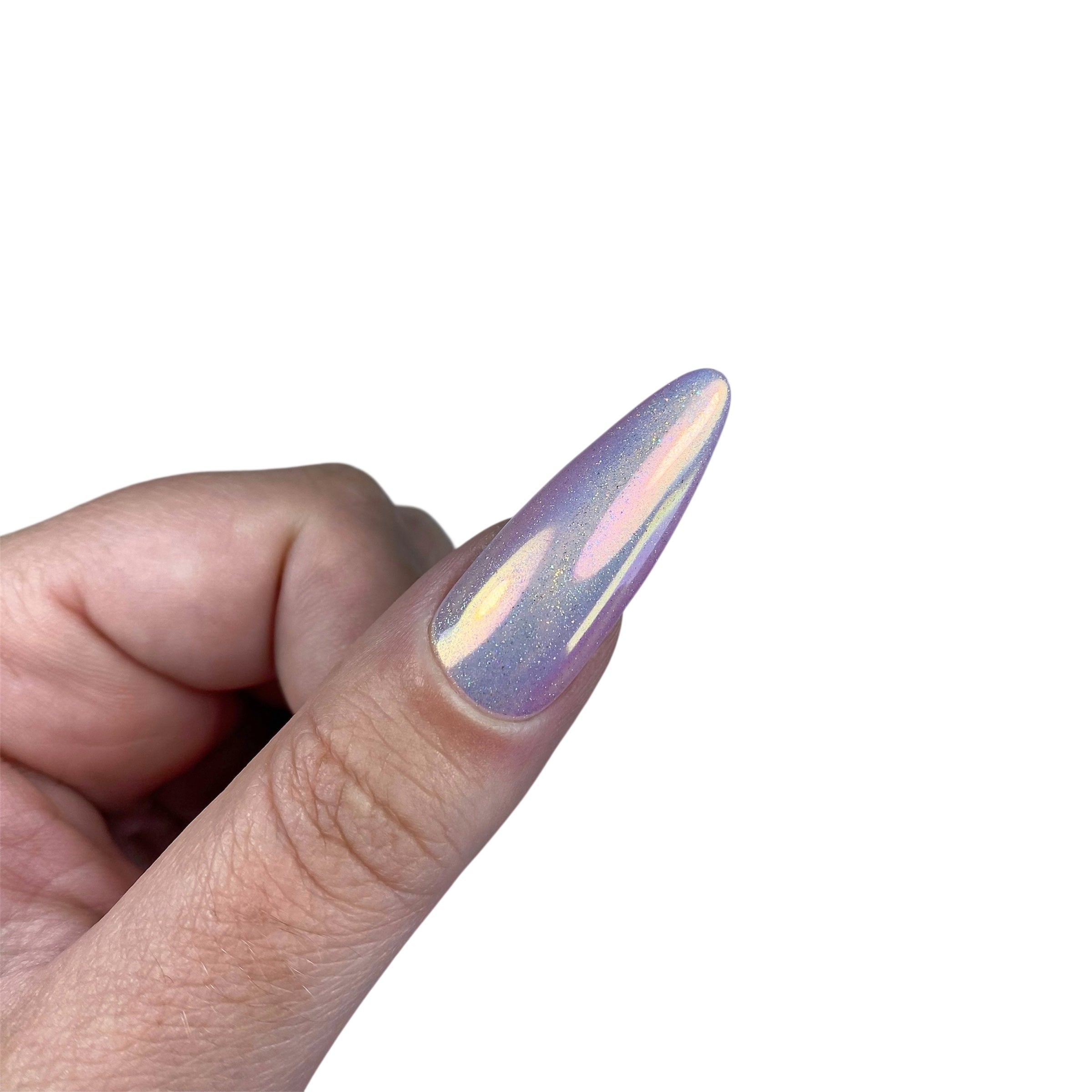 Poudre chrome rose orangé métallisée à reflet et légères paillettes holographiques.