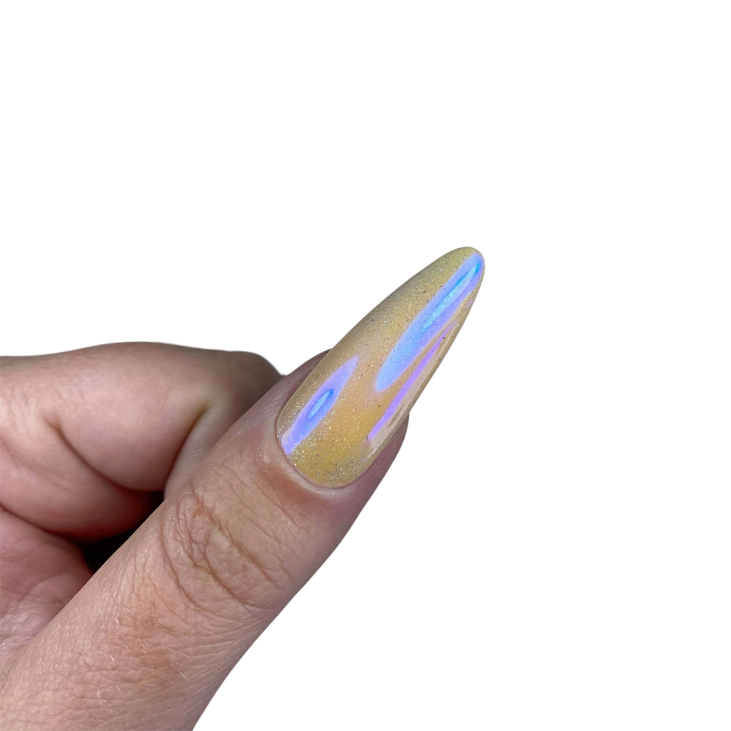 Poudre chrome bleu léger métallisée à reflet et légères paillettes holographiques.