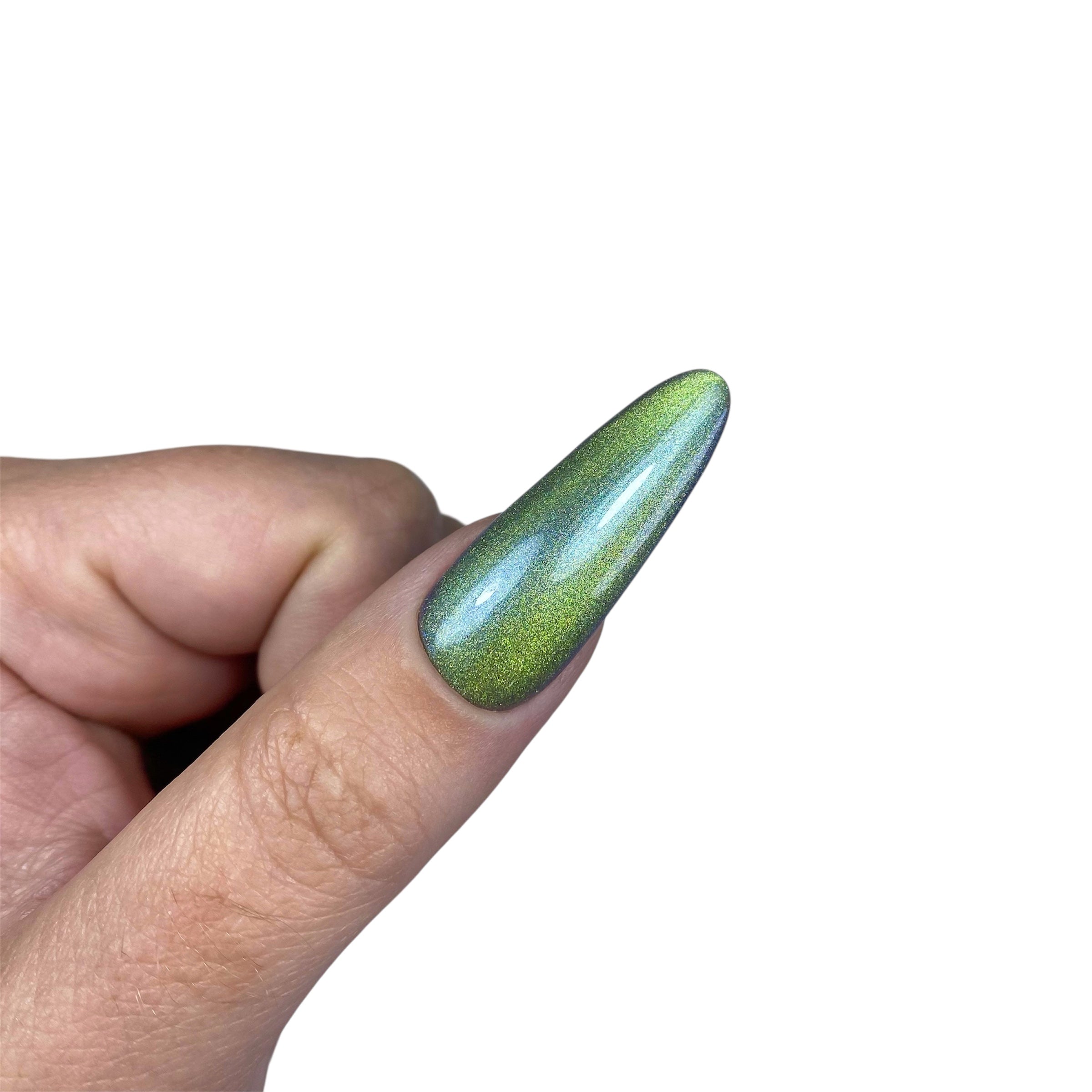 Vernis semi permanent cat eye TPO & Hema free (à utiliser avec un aimant) de couleur bleu violet avec un reflet vert .