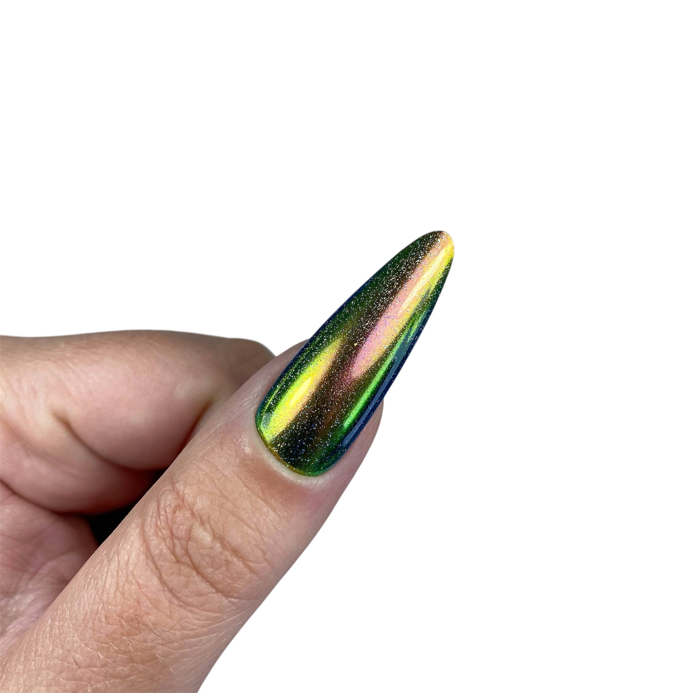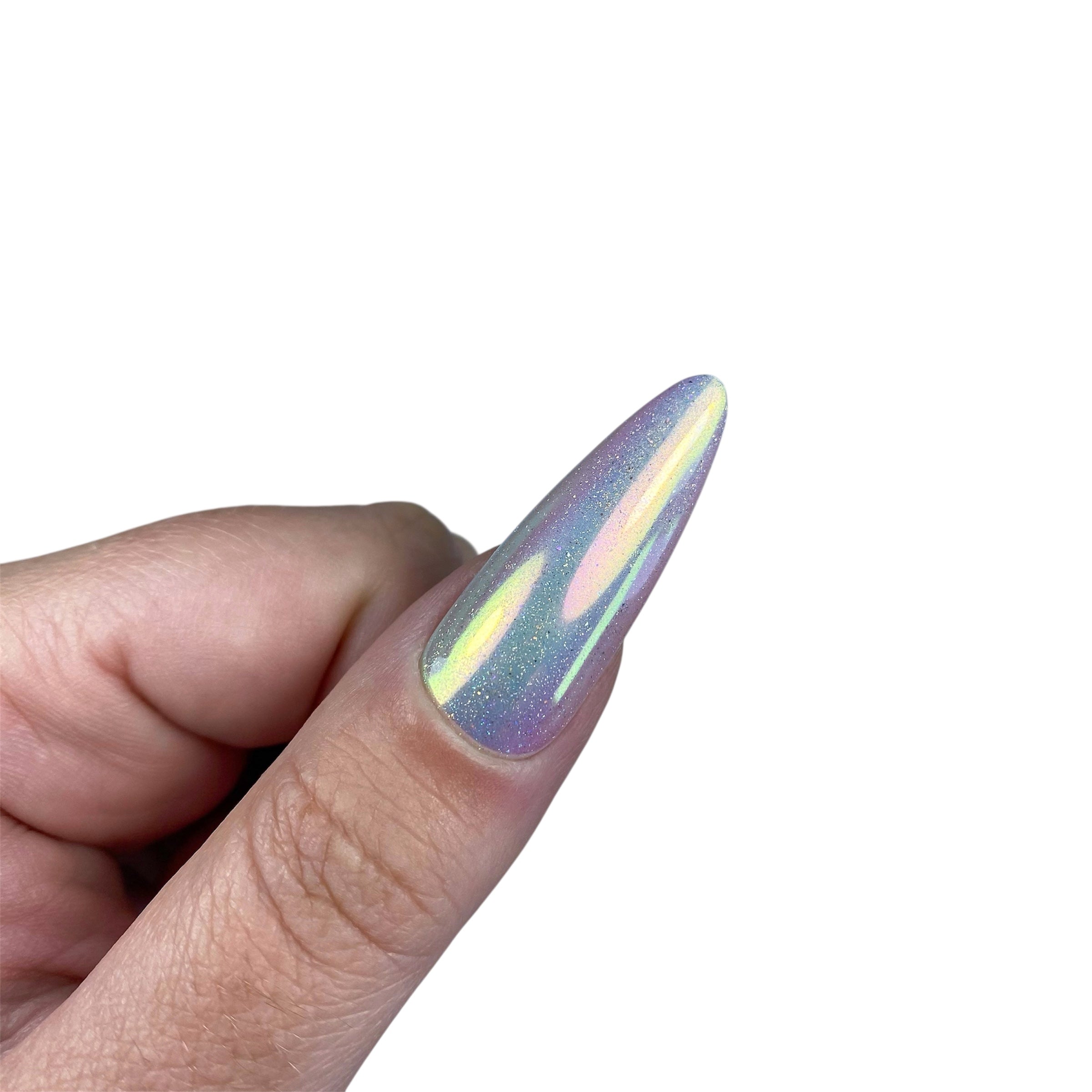 Poudre chrome type chameleon rose métallisée à reflet et légères paillettes holographiques.