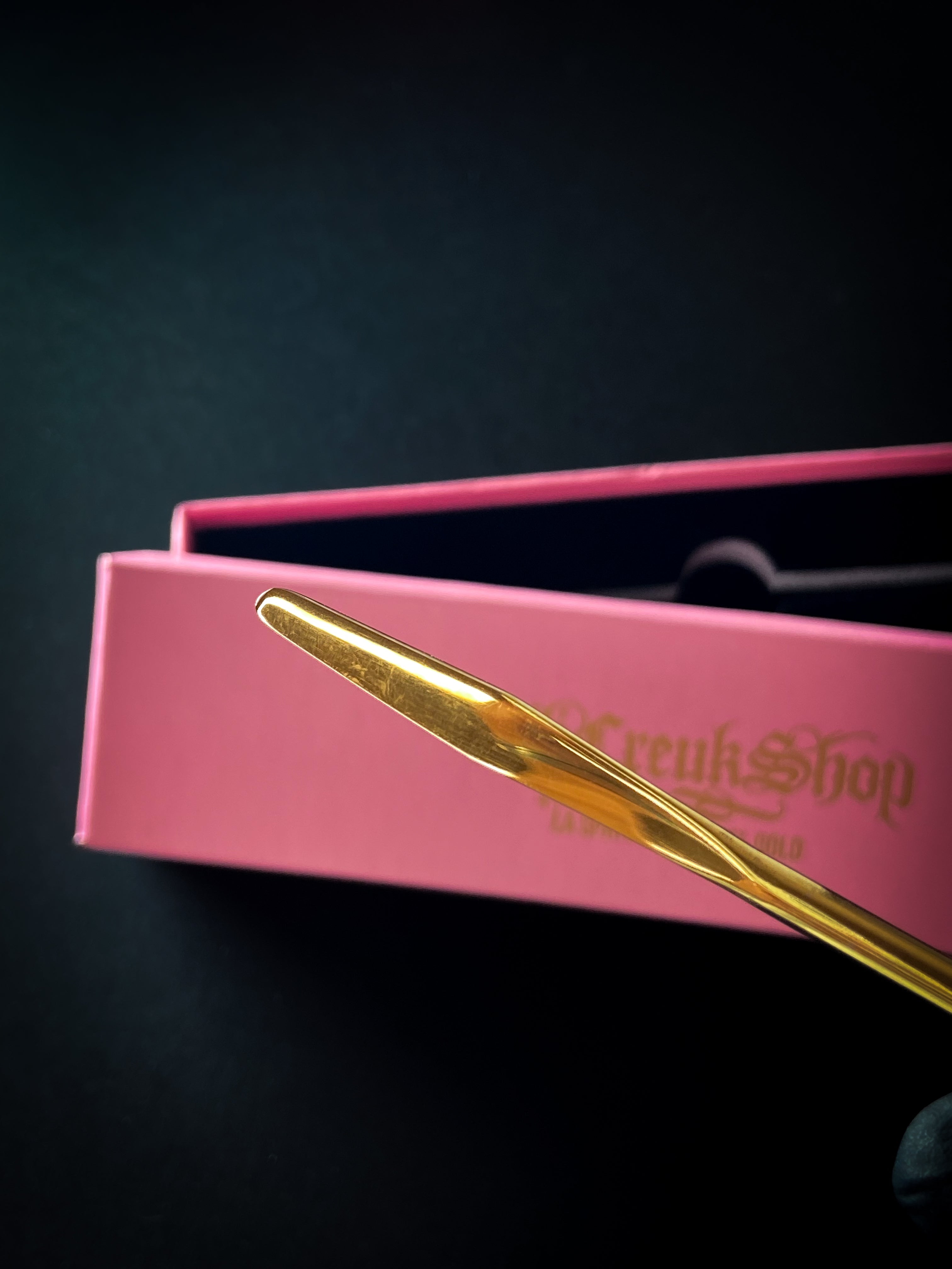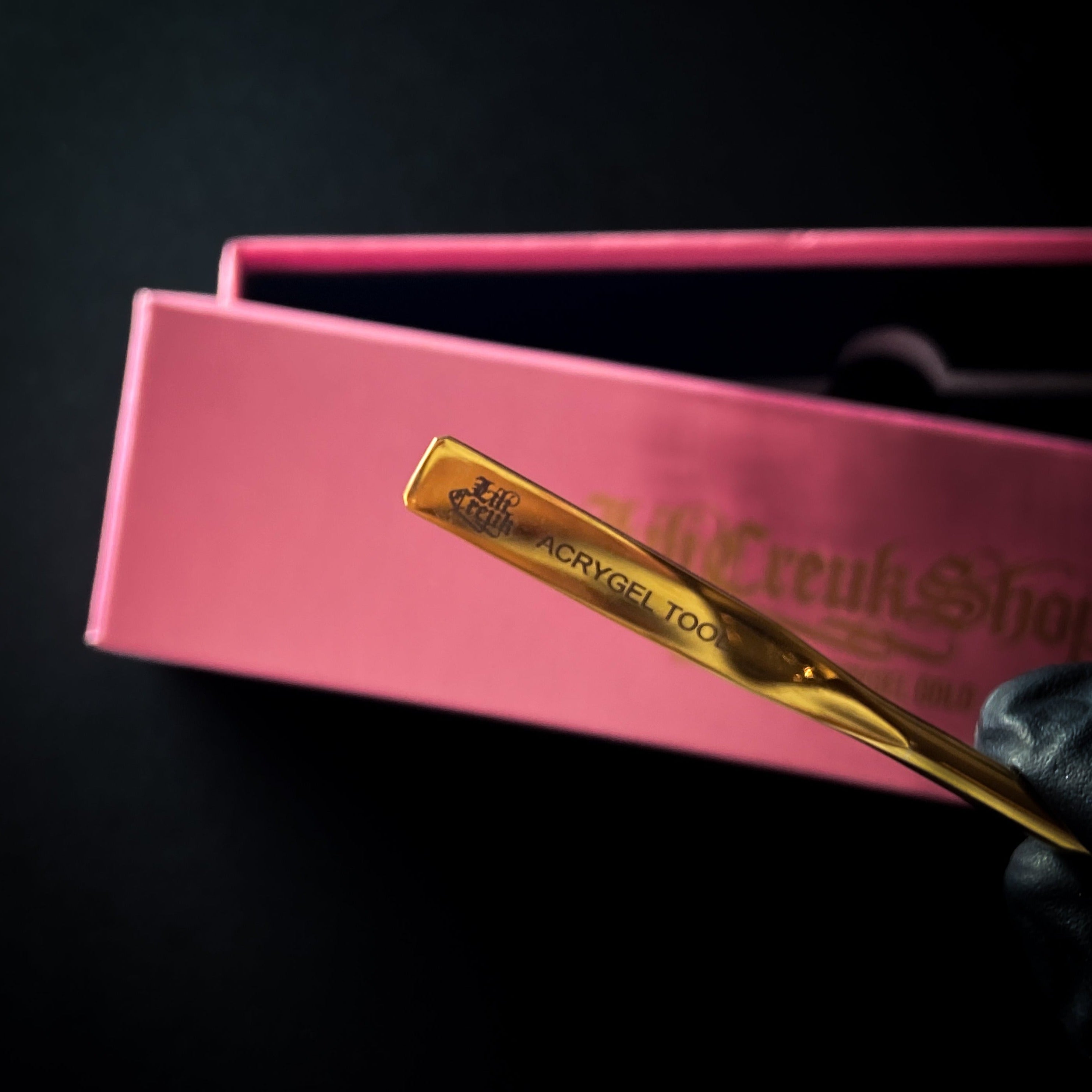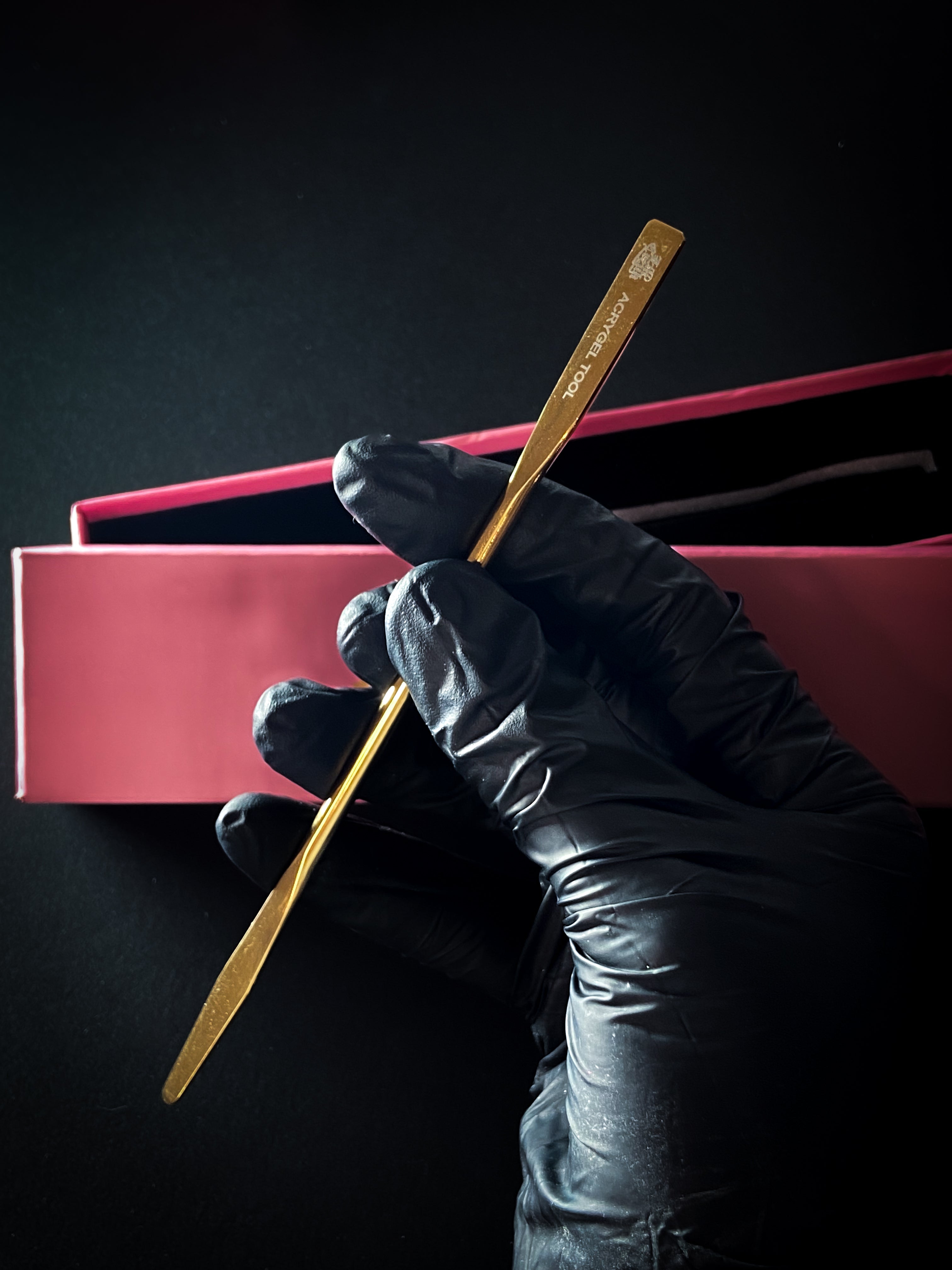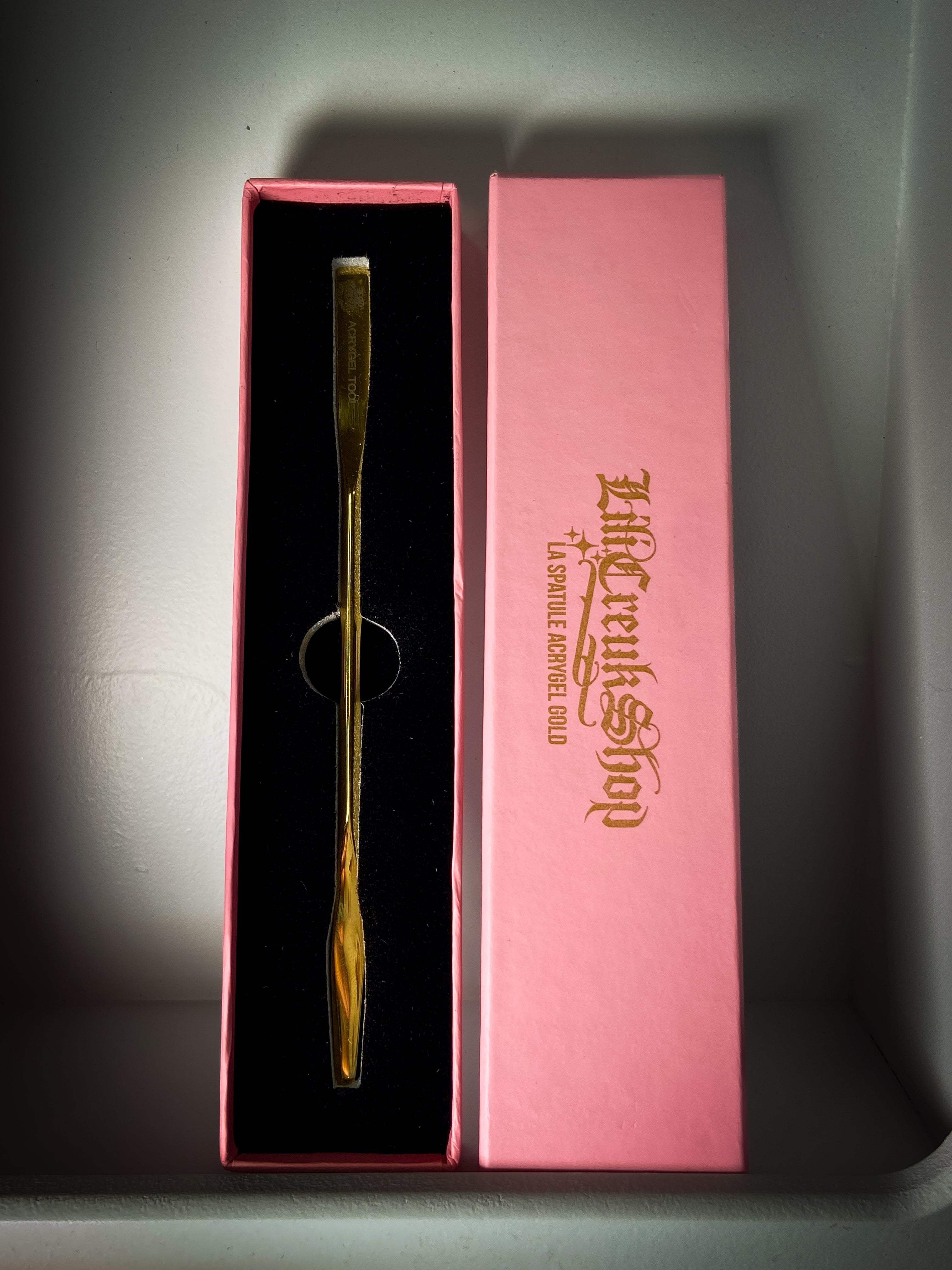 La spatule acrygel en titane et revêtement gold parfaite pour prélever l'agrygel à même le pot ou pour couper la matière qui sort du tube.