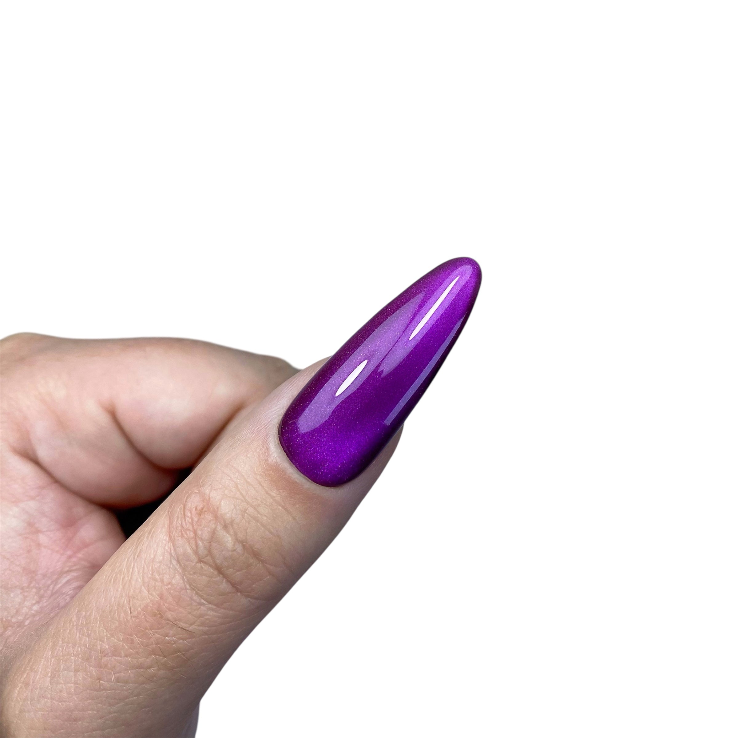 Vernis semi permanent cat eye TPO & Hema free (à utiliser avec un aimant) de couleur violet jelly avec une sous teinte orange et un reflet intense de la même couleur.