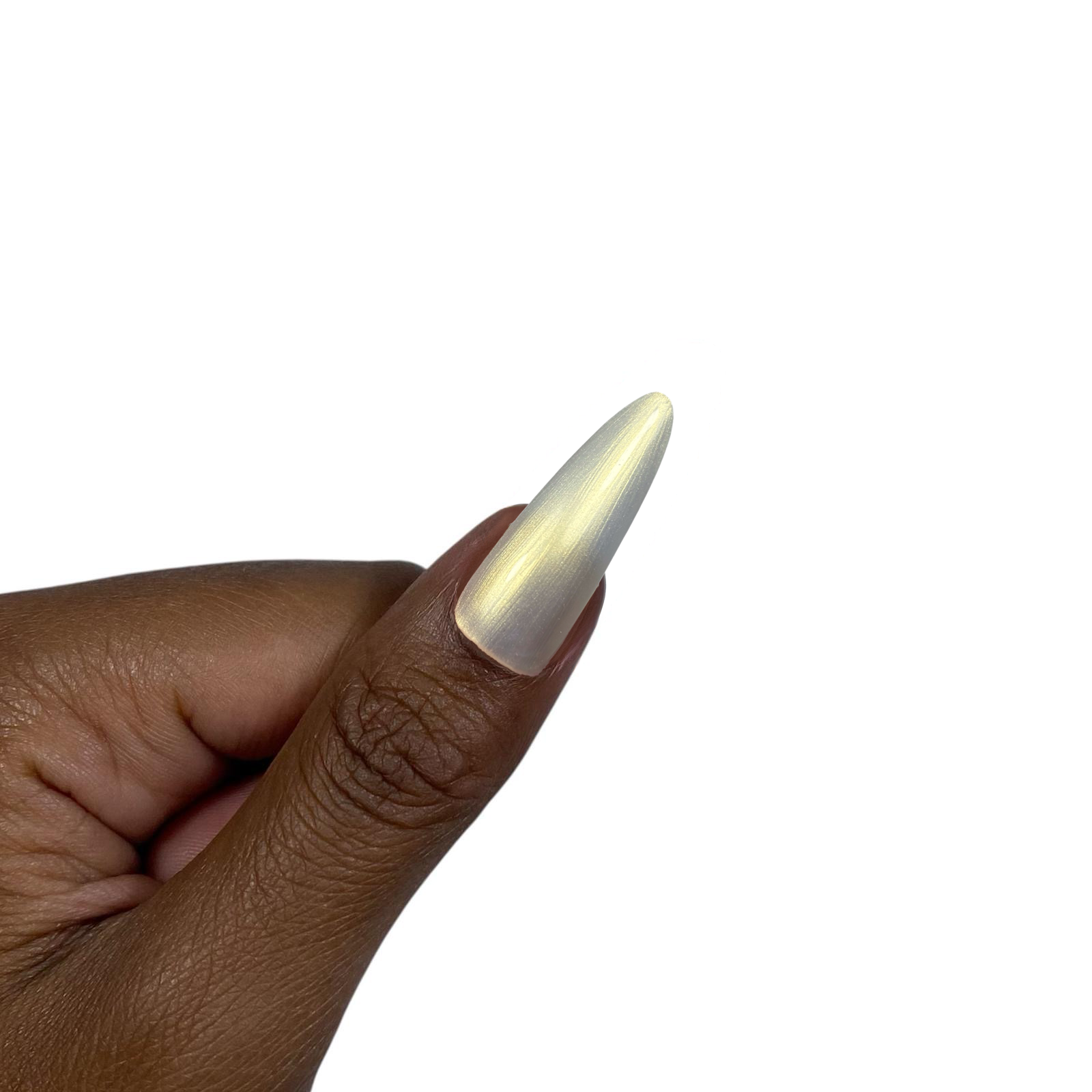 Vernis semi permanent perlé irisé blanc à reflet doré.