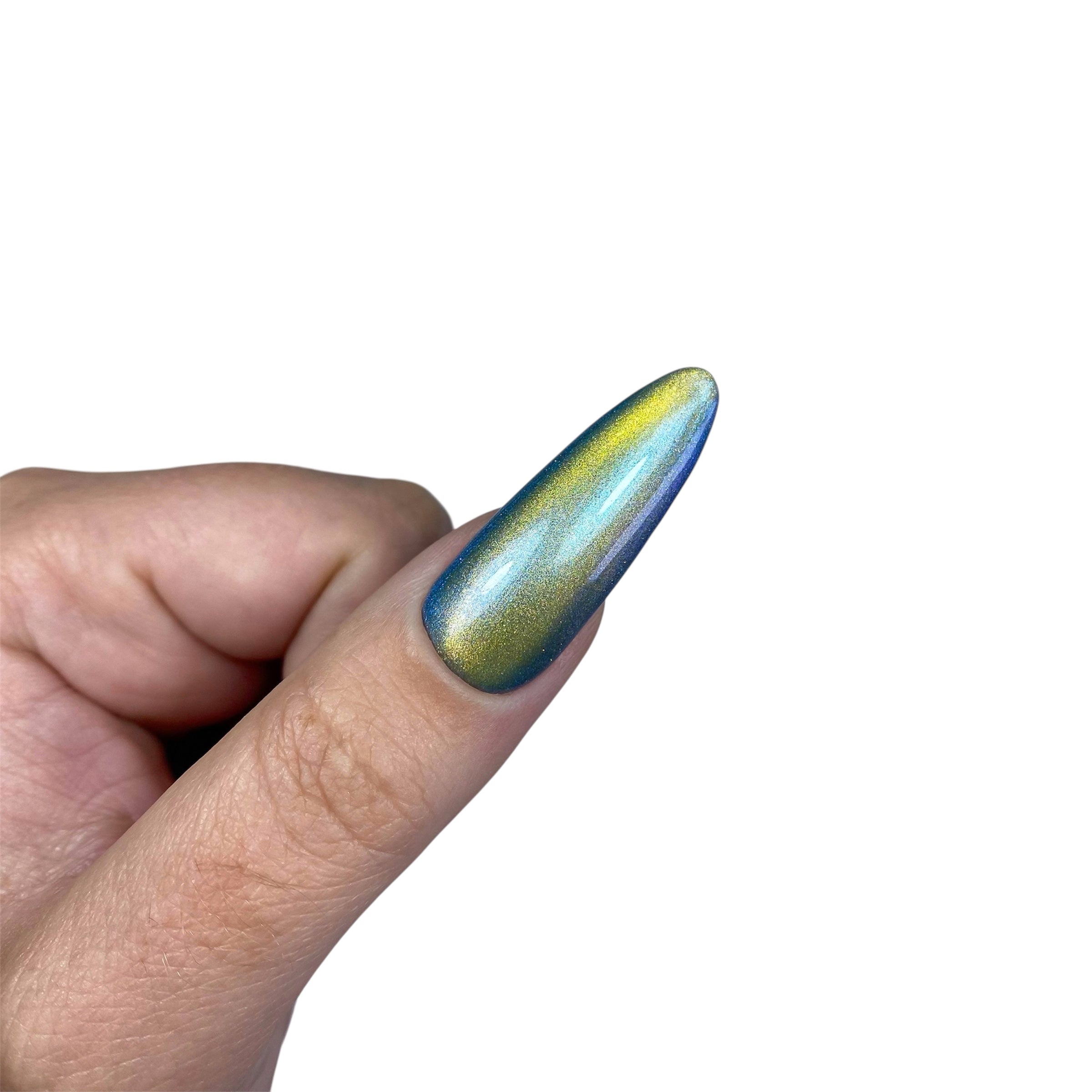Vernis semi permanent cat eye TPO & Hema free (à utiliser avec un aimant) de couleur Bleu acier avec un reflet Or / Jaune.